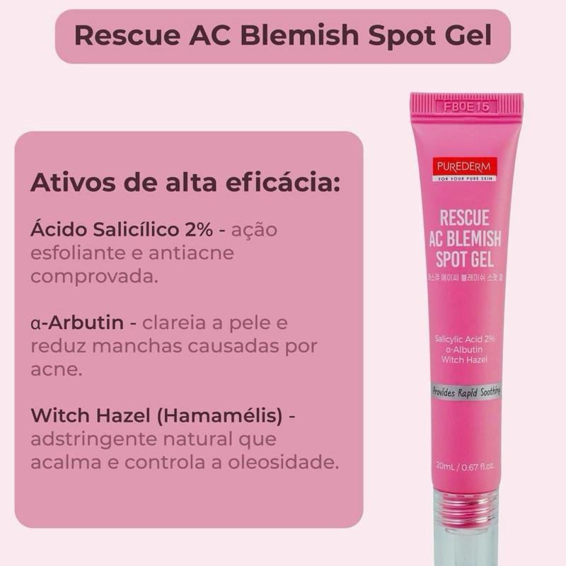 O gel que age direto no ponto. O Purederm Rescue AC Blemish Spot Gel é um tratamento localizado para espinhas que ajuda a secar, acalmar e reduzir a vermelhidão sem agredir a pele. Sua fórmula leve combina ingredientes anti-inflamatórios e purificantes que combatem a acne desde o início, enquanto protegem a barreira da pele.
